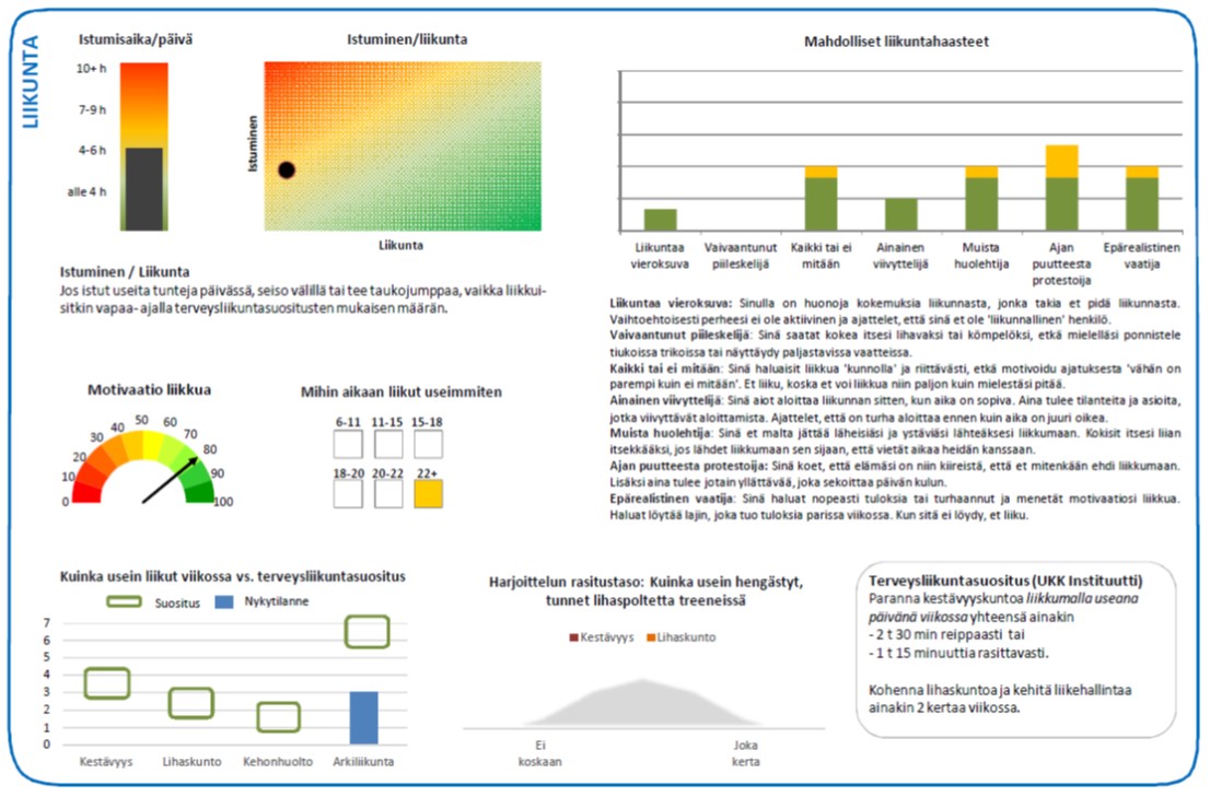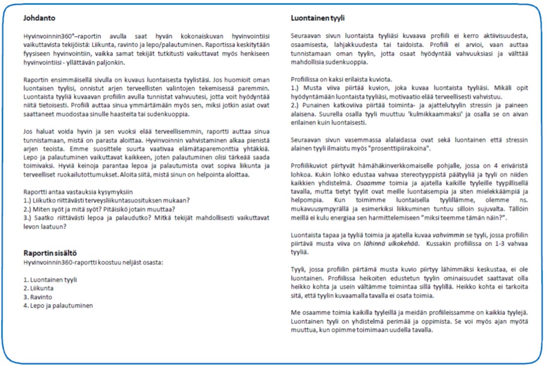 Raportin pohjalla on kysely, jolla kartoitetaan hyvinvointiin vaikuttavat tekijät kokonaisvaltaisesti ja kokoaa lähtötiedot visuaalisesti yhteen. Luontainen tyyli/osio kertoo siitä, minkälaista tietoa kukin tarvitsee motivaationsa vahvistukseksi ja miten on hyvä toimia, jotta motivaatio ei häviä matkan varrella.