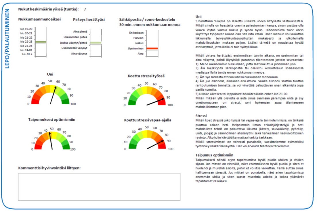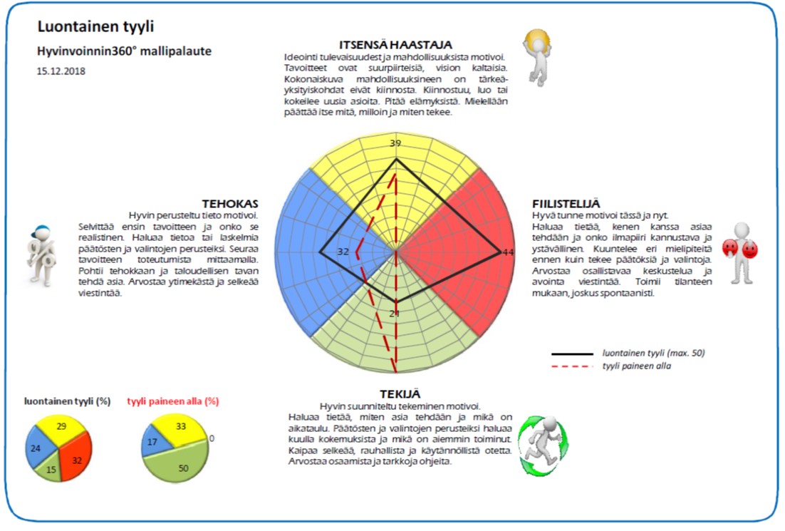 Tuloksena syntyvä raportti lisää itsetuntemusta, koska siihen tulostuvat hyvinvoinnin ylläpitämiseen liittyvät vahvuudet ja heikkoudet. Kun oppii tunnistamaan oman luontaisen tyylinsä, ymmärtää mitkä asiat vievät ja mitkä tuovat energiaa.