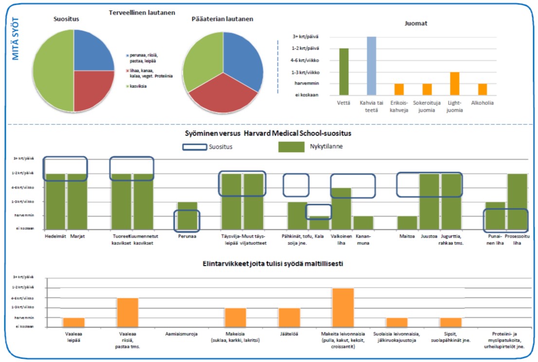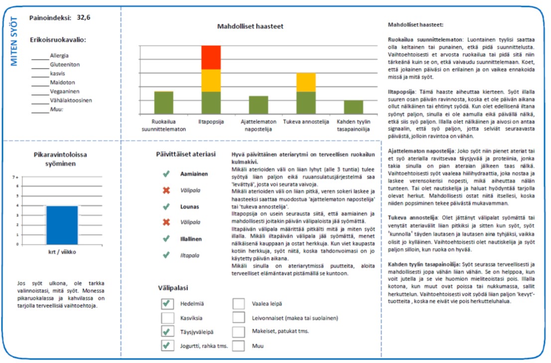 Hyvinvointinavigaattorin-raportti antaa kokonaisvaltaisen kuvan henkilön hyvinvointiin vaikuttavista tavoista ja tottumuksista. Raportissa käydään läpi: