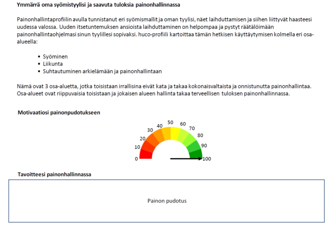Painonhallinta-profiilin avulla tunnistanut eri ruokailutottumusmallit ja oman mallisi, näet laihduttamisen ja siihen liittyvät haasteesi uudessa valossa. Uuden itsetuntemuksen ansioista laihduttaminen on helpompaa!