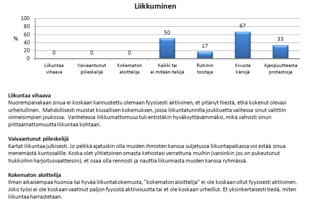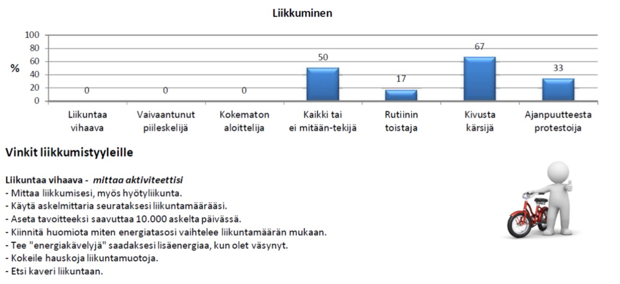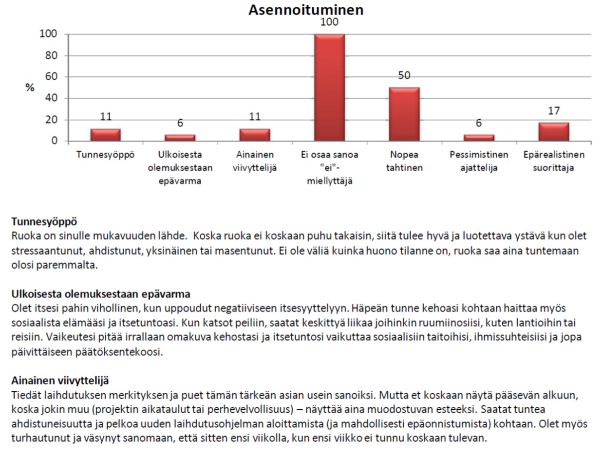 ”Tulokset ovat helposti tulkittavissa selkeiden palkkien muodossa ja niistä saa heti ensisilmäyksellä kiinni, mitkä ovat omat ongelma- ja kehittämiskohdat. Henkilökohtaisesta profiilista saa loistavat vinkit näihin kaikkiin kehitettäviin kohtiin! ”