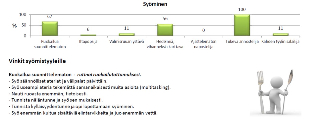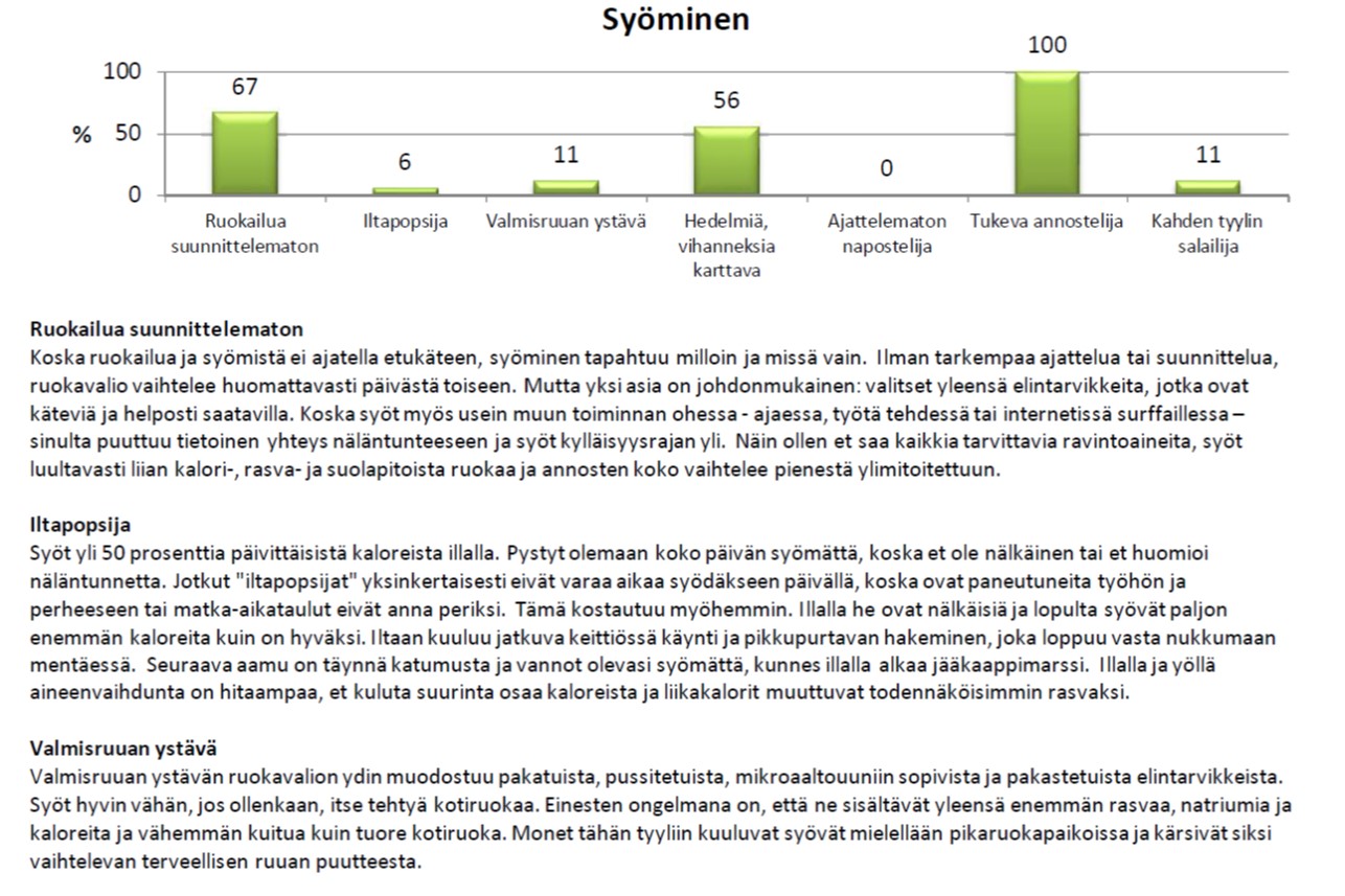 ”Profiili aukaisi silmät. Kyselyyn oli loppujenlopuksi aika helppo vastata. Kysymykset oli selkeitä ja vastausvaihtoehtoja oli tarpeeksi. Aikaa ei todellakaan mennyt kuin korkeintaan se 10 minuuttia. Vastaaminen oli tavallaan hauskaakin, kun jo kyselyä tehdessä oivalsi omat ”syömis”virheensä ja tekosyynsä välttääkseen niitä terveitä elämäntapoja. Yleensä tuskastun jos tekstiä on paljon. Valmis profiili on sopivan lyhyt luettavaksi ja tutkittavaksi, se on myös selkeä. Ohjeet ja vinkit ovat helppoja ja ne ovat osin ns.”päivänselviä” asioita, jotka tulee nyt profiilissa esiin hyvänä muistutuksena. Suosittelen kyllä muitakin tekemään oman profiilinsa ja näkemään omat ”piilotetut” virheet päivärutiineissaan.”