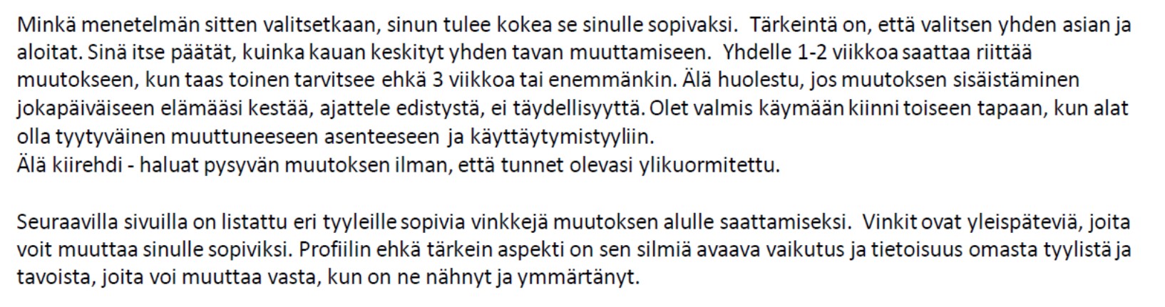 ”Hyvä työkalu itselle, jos on täysin hukassa, miten omaa toimintaa tulisi muuttaa tai sitten tueksi jo alkaneelle muutosmatkalle.”